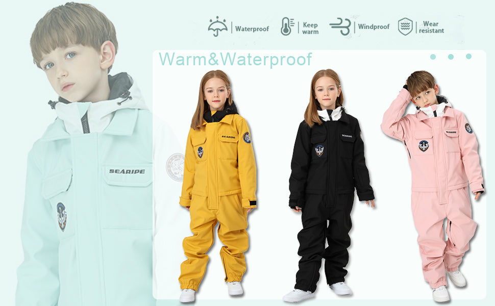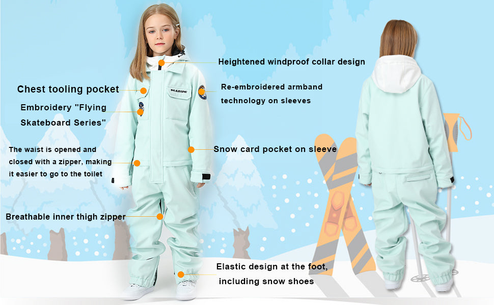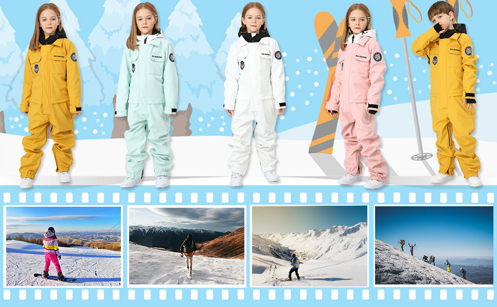 All in one ski suit is a classic and durable winter snowsuit that is sure to keep them warm, the ergonomic cut provides maximum comfort of movement, protected and happy even in the coldest of ski resorts.